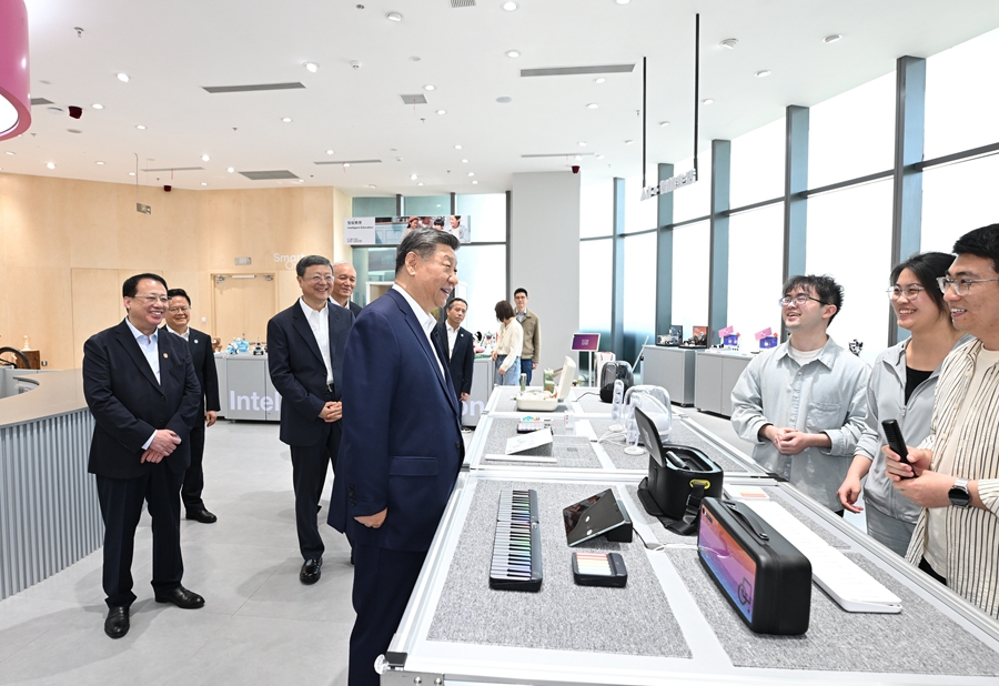 4月29日,中共中央总书记、国家主席、中央军委主席习近平在上海考察。这是习近平在位于徐汇区的上海“模速空间”大模型创新生态社区人工智能产品体验店考察。